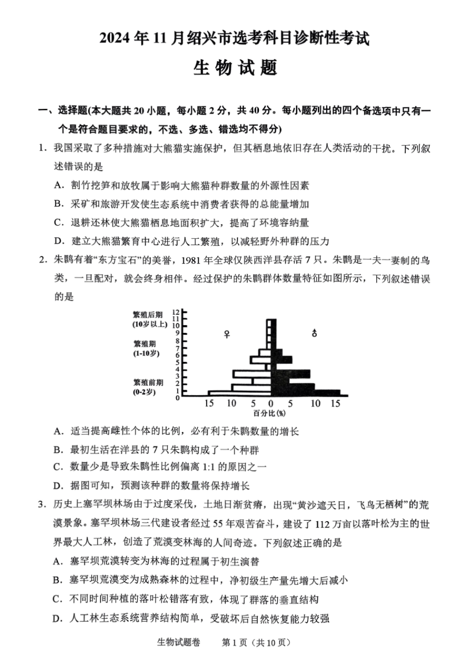 浙江省绍兴市一模11月诊断考试生物试卷含答案.pdf_第1页