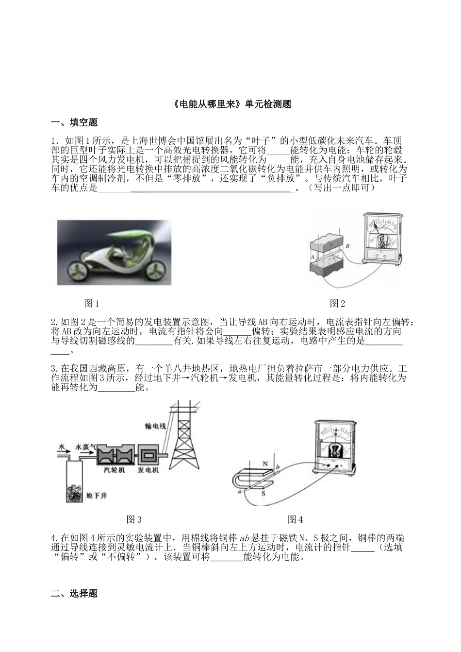 《电能从哪里来》单元检测题一、填空题1.如图1所示,是上海世博会中国馆展出名为“叶子”的小型低碳化未来汽车。车顶部的巨型叶子实际上是一个高效光电转换器,它可将_____能转化为电能;车轮的轮毂其实是四个风...