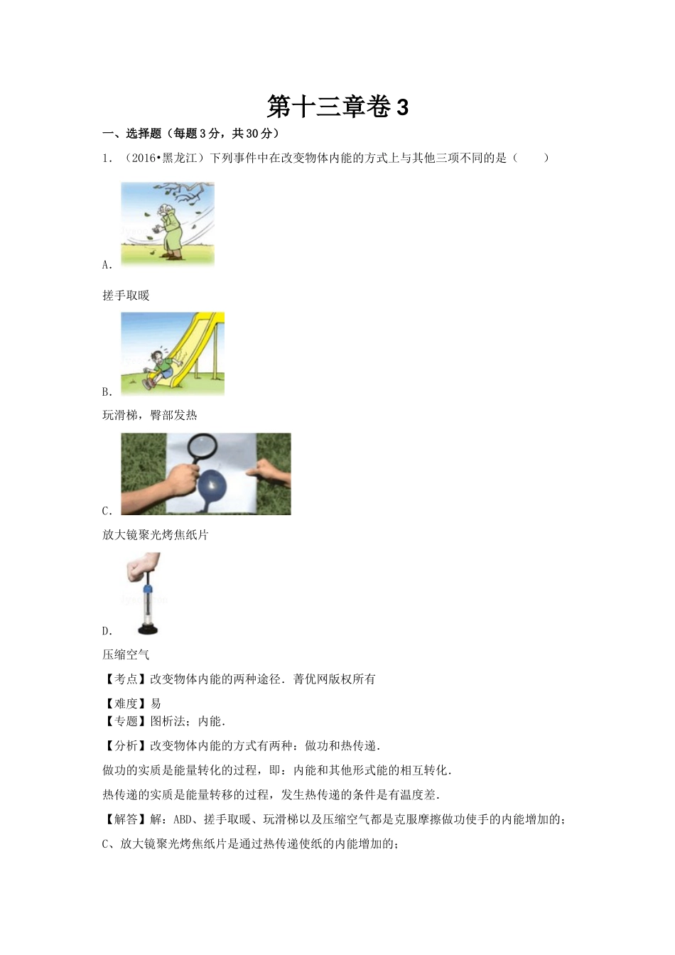第十三章卷3一、选择题(每题3分,共30分)1.(2016•黑龙江)下列事件中在改变物体内能的方式上与其他三项不同的是()A.搓手取暖B.玩滑梯,臀部发热C.放大镜聚光烤焦纸片D.压缩空气【考点】改变物体内能的...