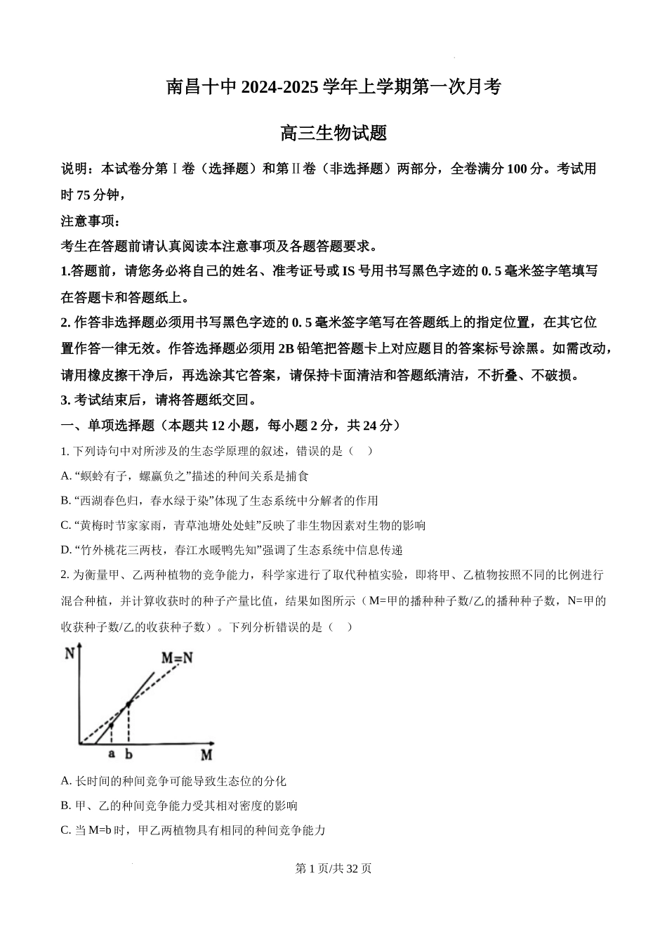 南昌十中2024-2025学年上学期第一次月考高三生物试题说明:本试卷分第Ⅰ卷(选择题)和第Ⅱ卷(非选择题)两部分,全卷满分100分。考试用时75分钟,注意事项:考生在答题前请认真阅读本注意事项及各题答题要求。1...