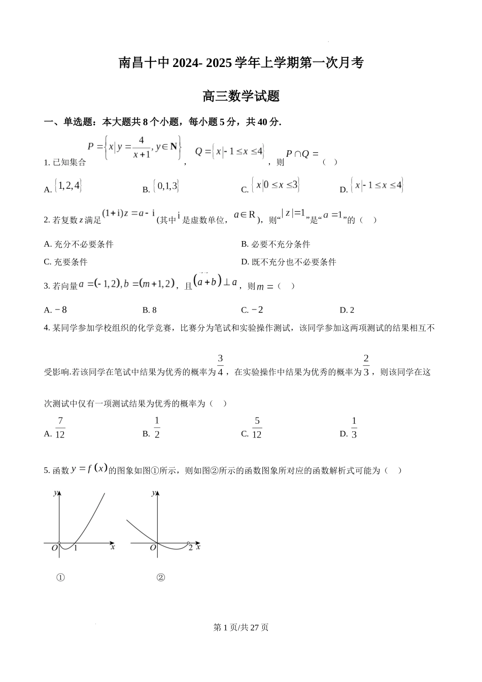 南昌十中2024-2025学年上学期第一次月考高三数学试题一、单选题:本大题共8个小题,每小题5分,共40分.1.已知集合,,则()A.B.C.D.2.若复数z满足(其中是虚数单位,),则“”是“”的()A.充分不必要条件B.必要...