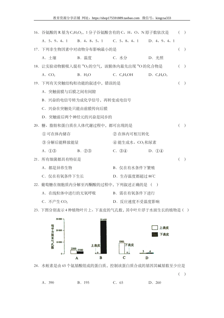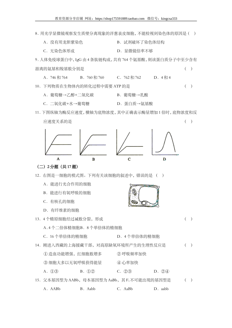 教育资源分享店铺网址:https://shop175591889.taobao.com微信号:kingcsa3332003年全国普通高等学校招生统一考试上海生物试卷考生注意:1.满分150分。考试时间为120分钟。2.答第Ⅰ卷前,考生务必在答题卡上用钢...