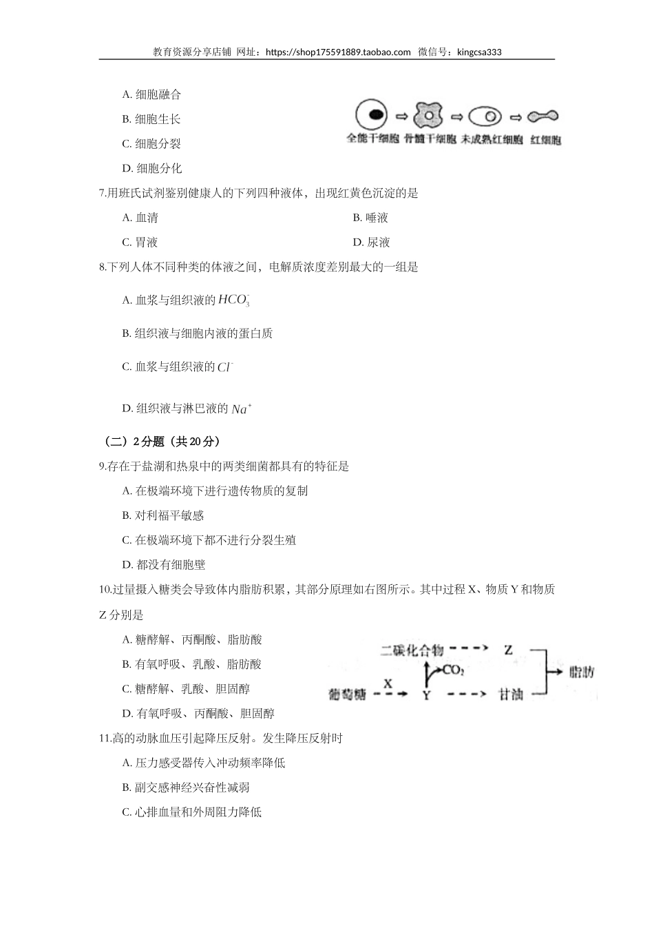 教育资源分享店铺网址:https://shop175591889.taobao.com微信号:kingcsa3332009年全国普通高等学校招生统一考试上海生物试卷考生注意:1.满分150分。考试时间为120分钟。2.答第Ⅰ卷前,考生务必在答题卡上用钢...