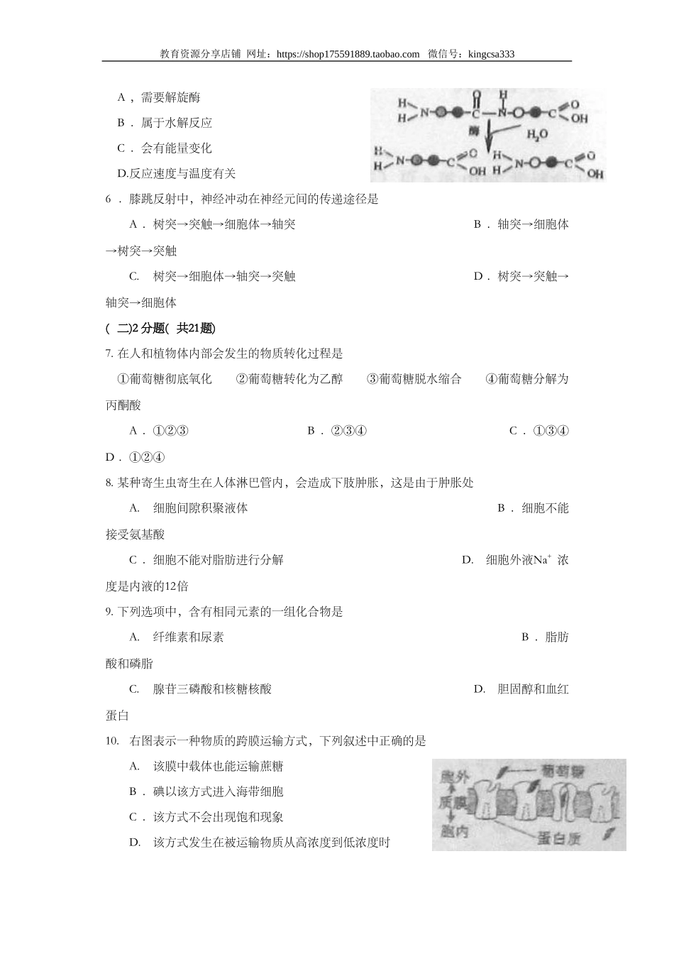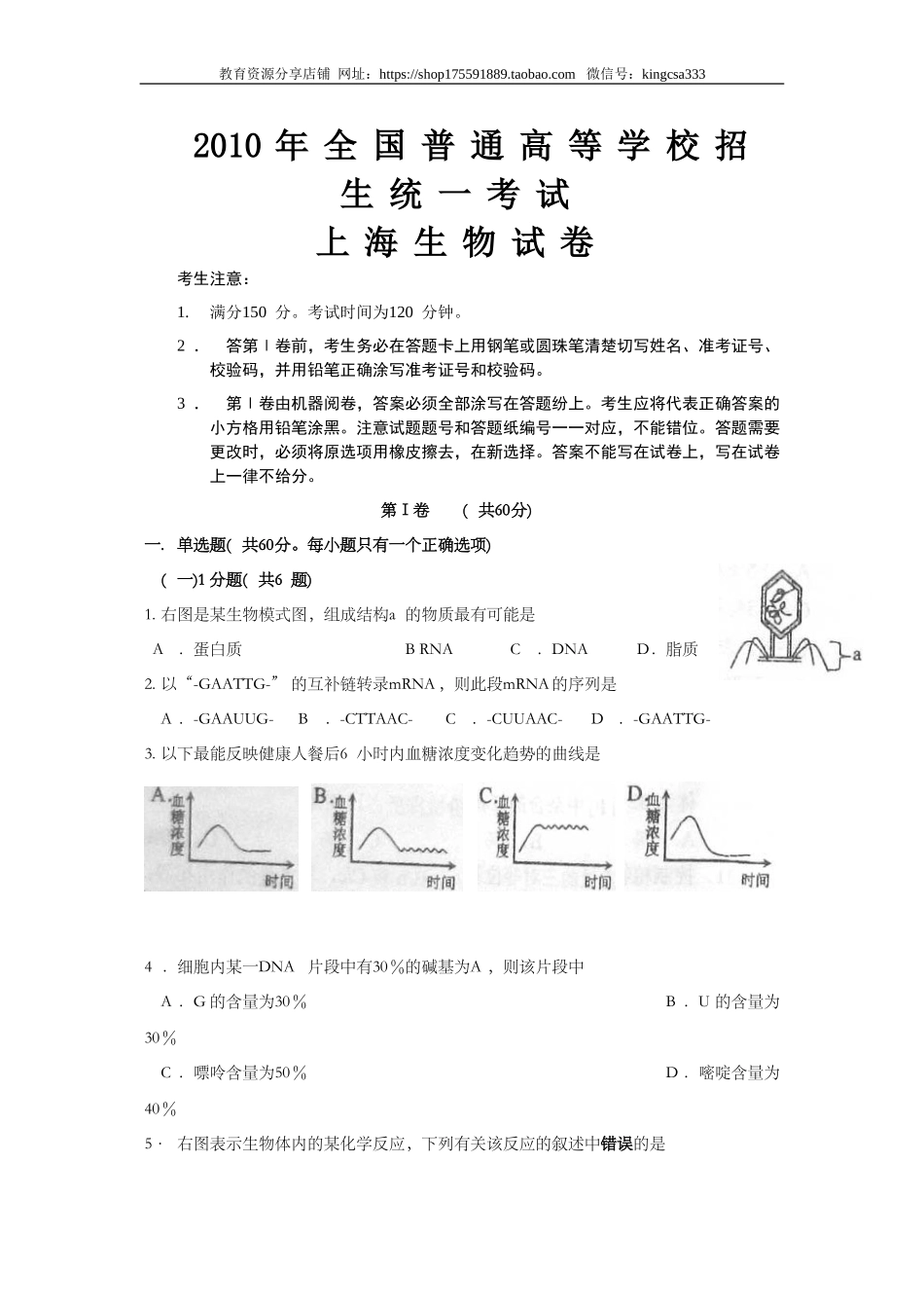 教育资源分享店铺网址:https://shop175591889.taobao.com微信号:kingcsa3332010年全国普通高等学校招生统一考试上海生物试卷考生注意:1.满分150分。考试时间为120分钟。2.答第Ⅰ卷前,考生务必在答题卡上用钢...