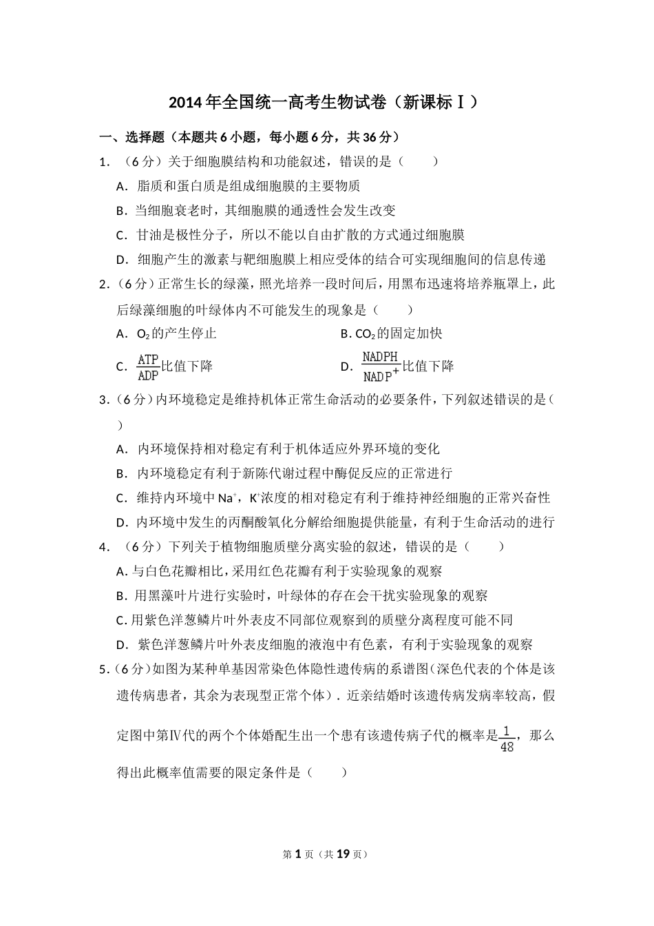 2014年全国统一高考生物试卷(新课标Ⅰ)一、选择题(本题共6小题,每小题6分,共36分)1.(6分)关于细胞膜结构和功能叙述,错误的是()A.脂质和蛋白质是组成细胞膜的主要物质B.当细胞衰老时,其细胞膜的通...