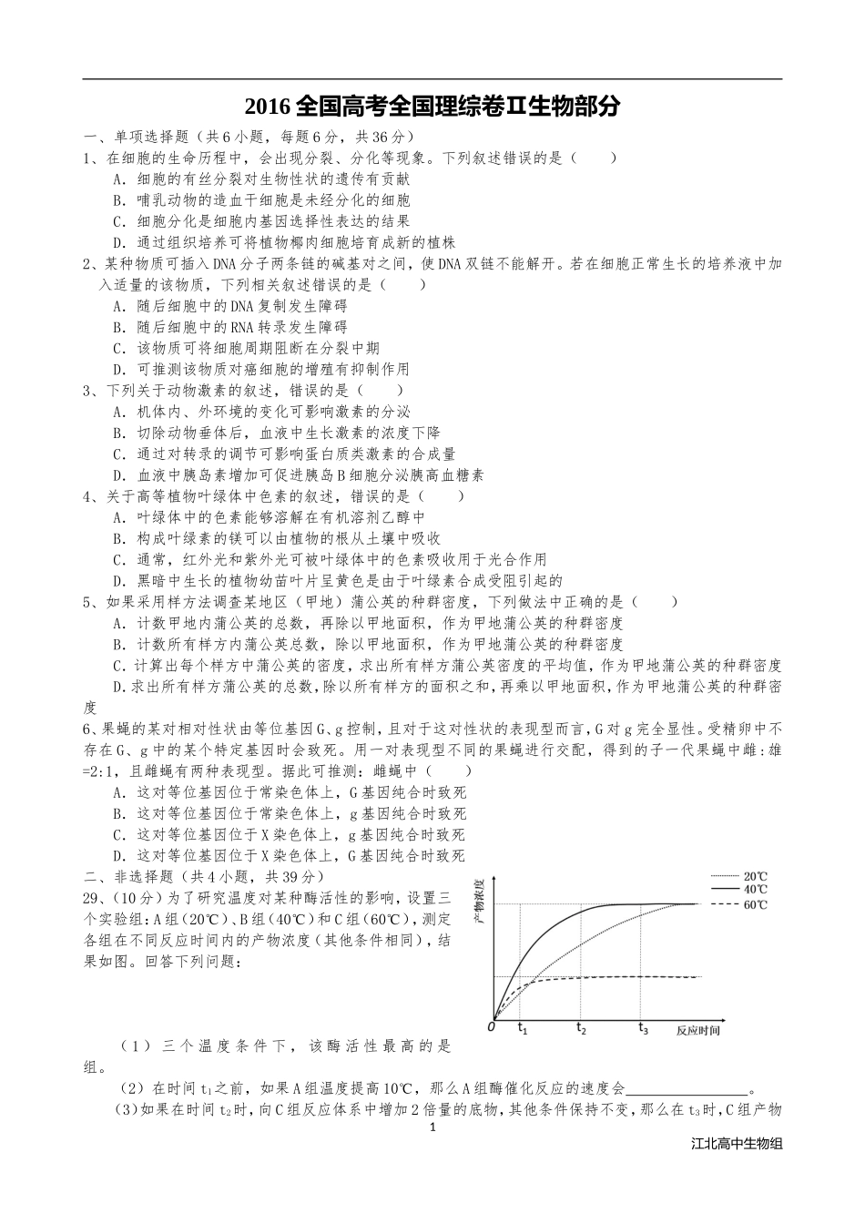2016全国高考全国理综卷Ⅱ生物部分一、单项选择题(共6小题,每题6分,共36分)1、在细胞的生命历程中,会出现分裂、分化等现象。下列叙述错误的是()A.细胞的有丝分裂对生物性状的遗传有贡献B.哺乳动物的造血...