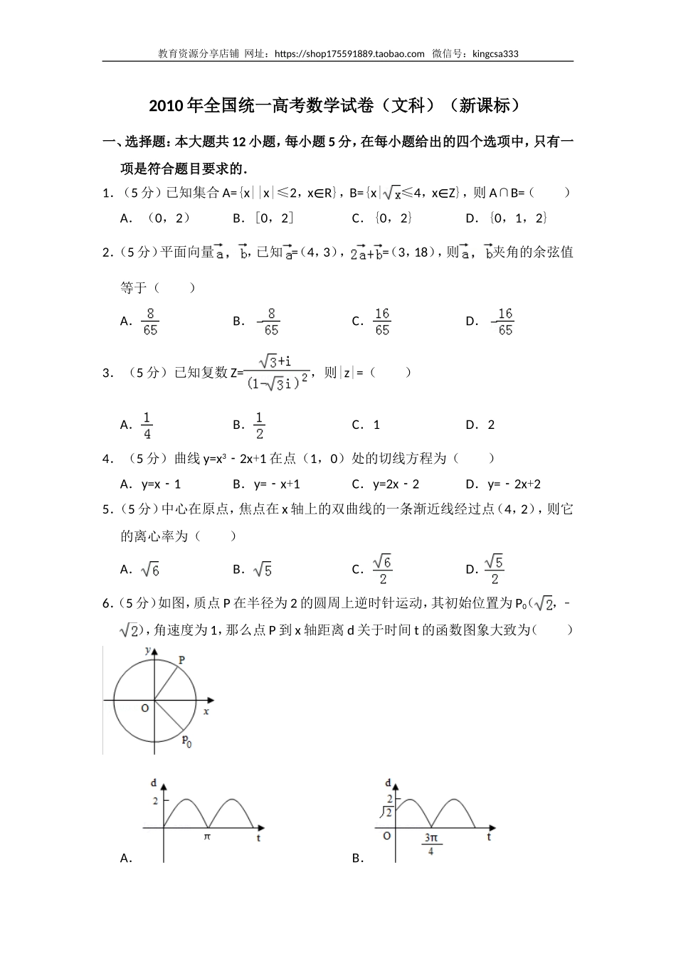 教育资源分享店铺网址:https://shop175591889.taobao.com微信号:kingcsa3332010年全国统一高考数学试卷(文科)(新课标)一、选择题:本大题共12小题,每小题5分,在每小题给出的四个选项中,只有一项是符合题...