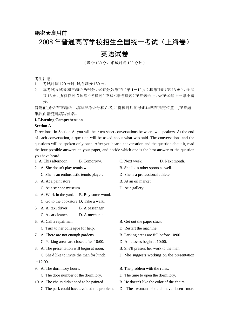 绝密★启用前2008年普通高等学校招生全国统一考试(上海卷)英语试卷(满分150分,考试时间100分钟)考生注意:1.考试时间120分钟,试卷满分150分。2.本考试设试卷和答题纸两部分。试卷分为第I卷(第1-12页)和第...