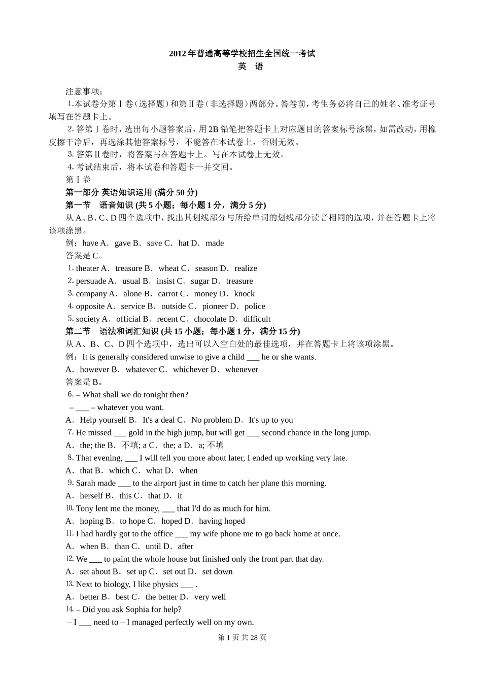 第1页共28页2012年普通高等学校招生全国统一考试英语注意事项:⒈本试卷分第Ⅰ卷(选择题)和第Ⅱ卷(非选择题)两部分。答卷前,考生务必将自己的姓名、准考证号填写在答题卡上。⒉答第Ⅰ卷时,选出每小题答案后...