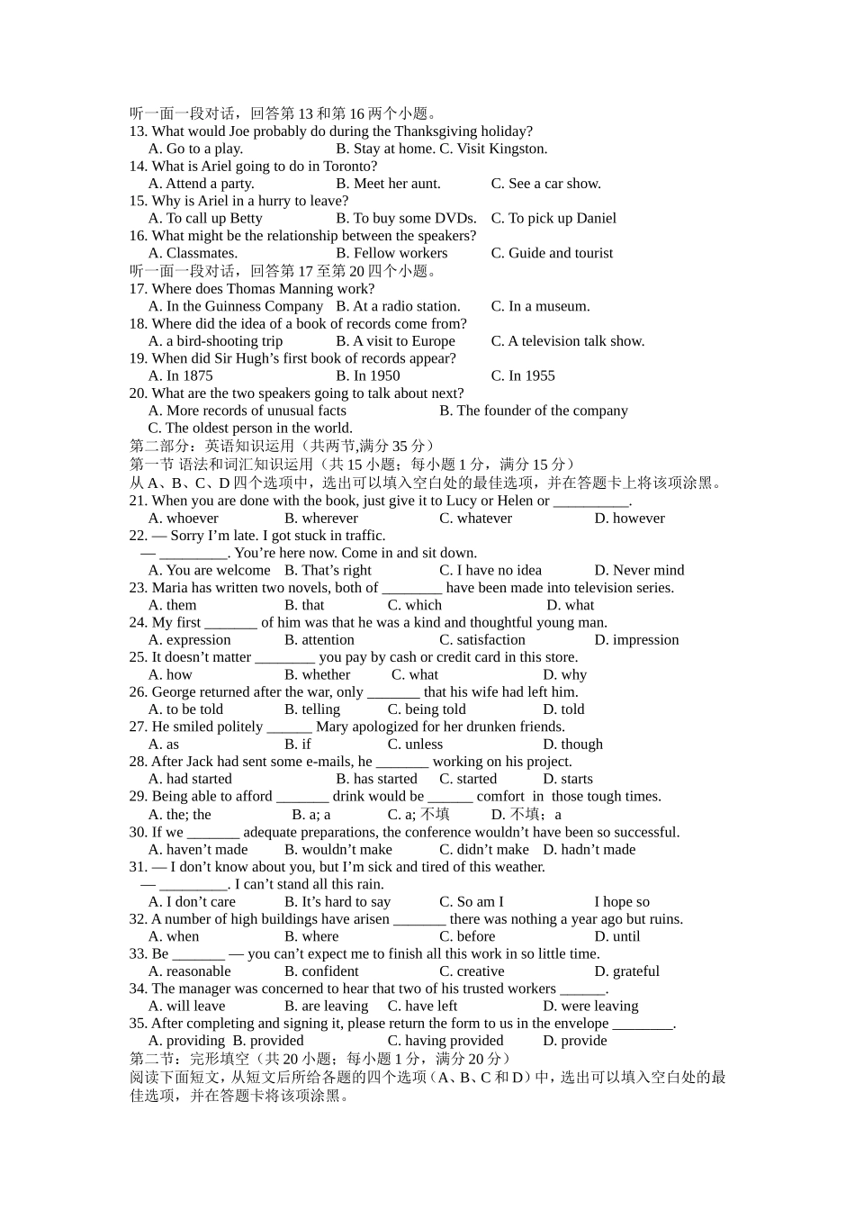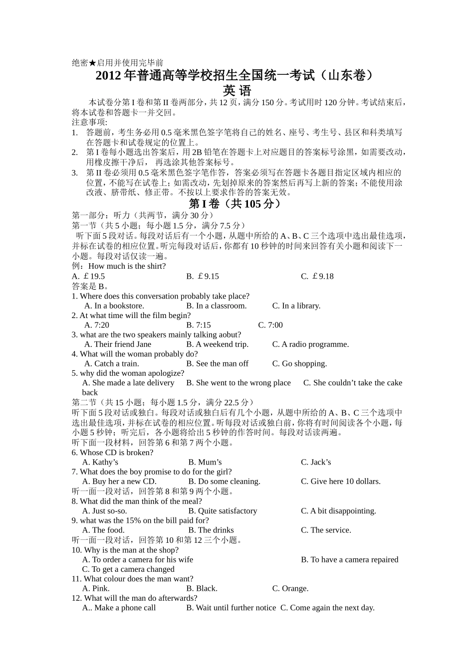 绝密★启用并使用完毕前2012年普通高等学校招生全国统一考试(山东卷)英语本试卷分第I卷和第II卷两部分,共12页,满分150分。考试用时120分钟。考试结束后,将本试卷和答题卡一并交回。注意事项:1.答题前,考生...