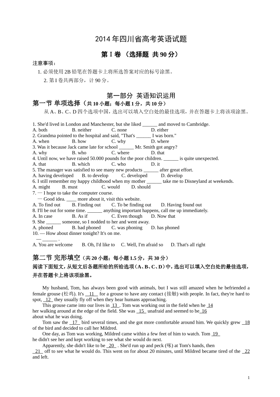 2014年四川省高考英语试题第I卷(选择题共90分)注意事项:1.必须使用2B铅笔在答题卡上将所选答案对应的标号涂黑。2.第I卷共两部分,计90分。第一部分英语知识运用第一节单项选择(共10小题;每小题1分,共10分...