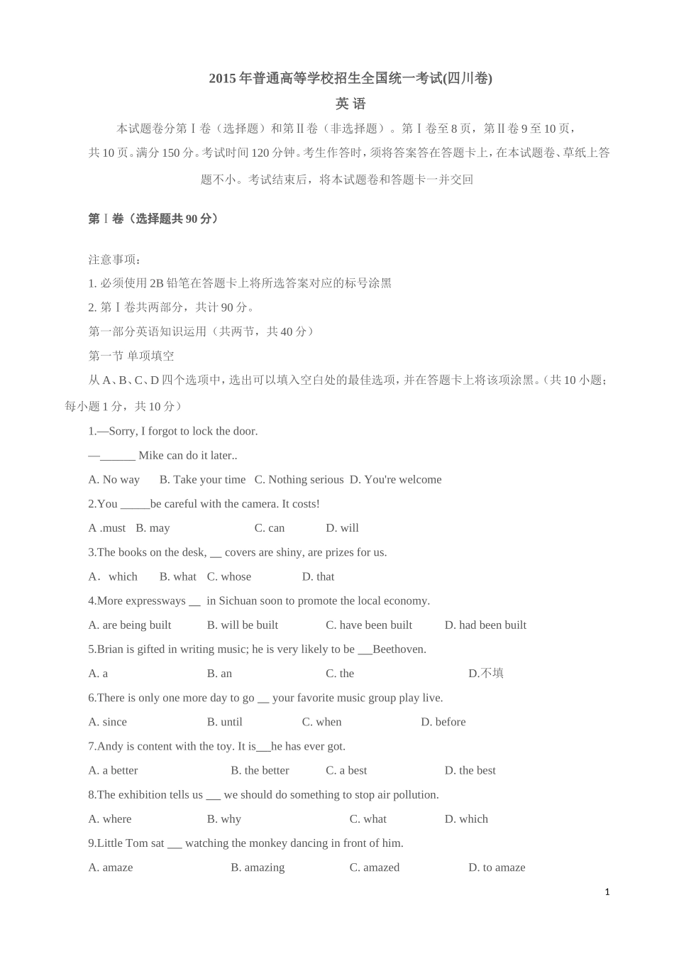 2015年普通高等学校招生全国统一考试(四川卷)英语本试题卷分第Ⅰ卷(选择题)和第Ⅱ卷(非选择题)。第Ⅰ卷至8页,第Ⅱ卷9至10页,共10页。满分150分。考试时间120分钟。考生作答时,须将答案答在答题卡上,在本...