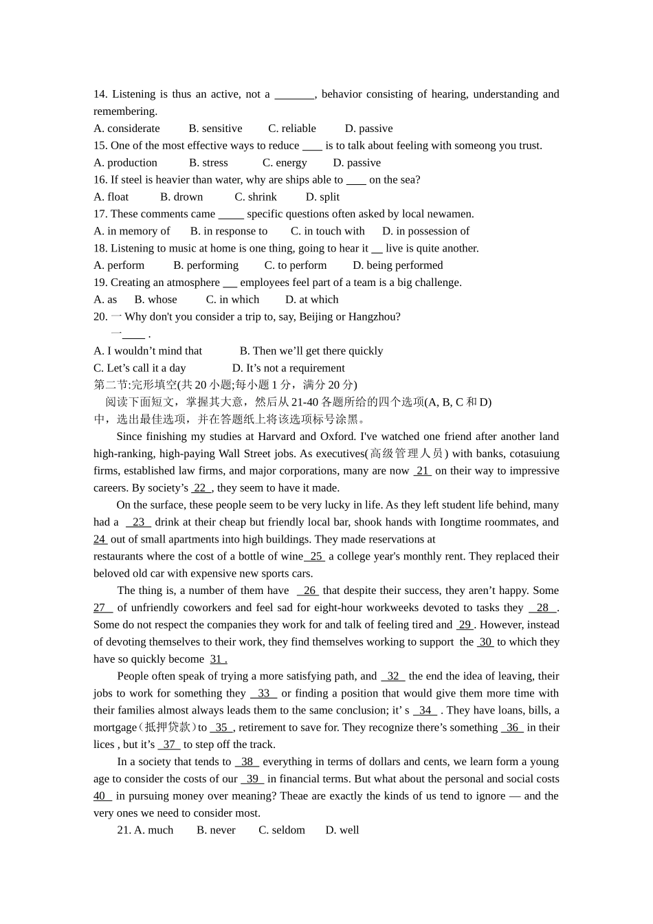 英语试题选择题部分(共80分)第一部分:英语知识运用(共两节,满分30分!第一节:单项填空(共20小题;每小题0.5分,满分10分)从A、B、C和D四个选项中,选出可以填人空白处的最佳选项,并在答题纸上将该选项标号涂黑。1...