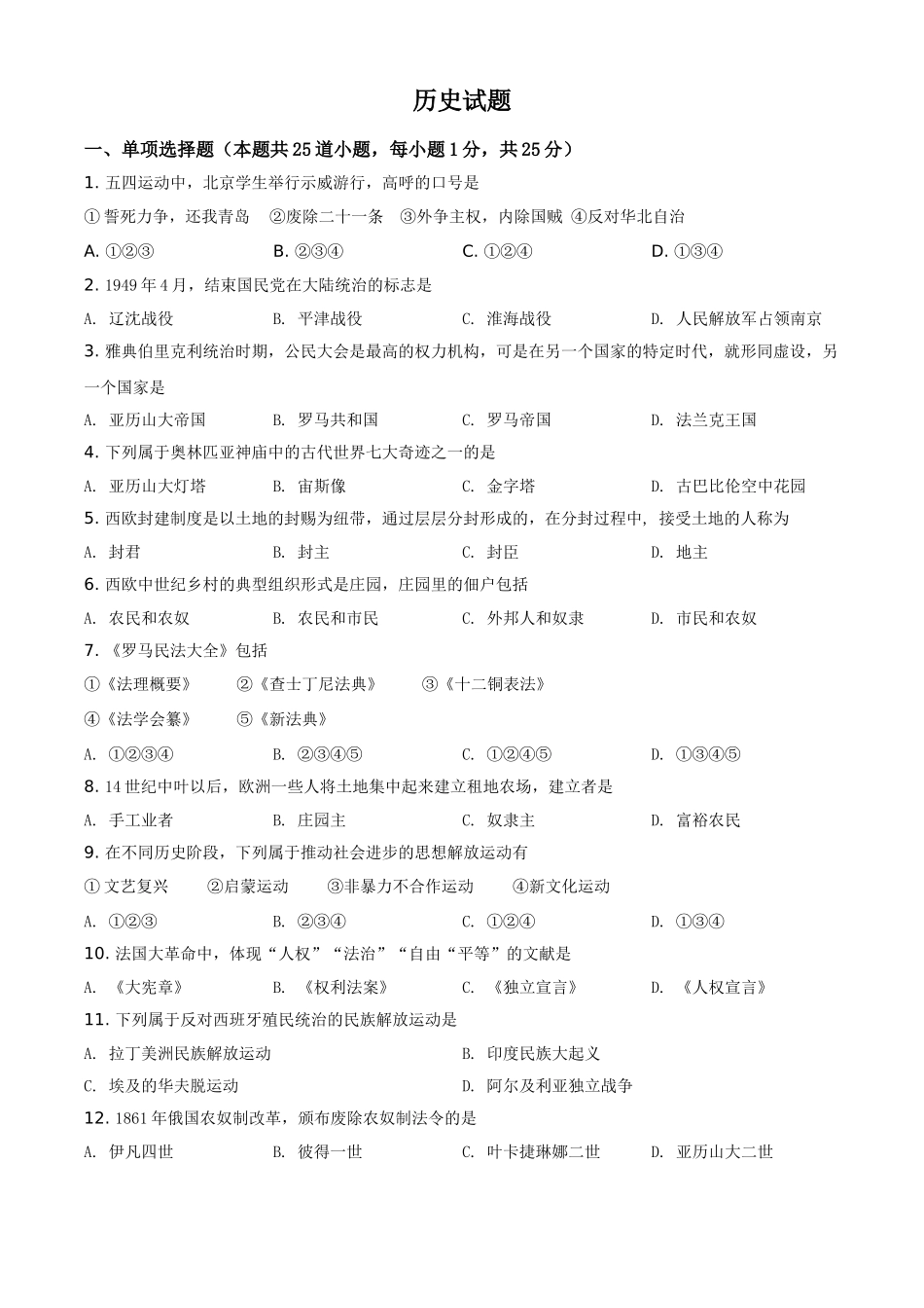历史试题一、单项选择题(本题共25道小题,每小题1分,共25分)1.五四运动中,北京学生举行示威游行,高呼的口号是①誓死力争,还我青岛②废除二十一条③外争主权,内除国贼④反对华北自治A.①②③B.②③④C.①②...