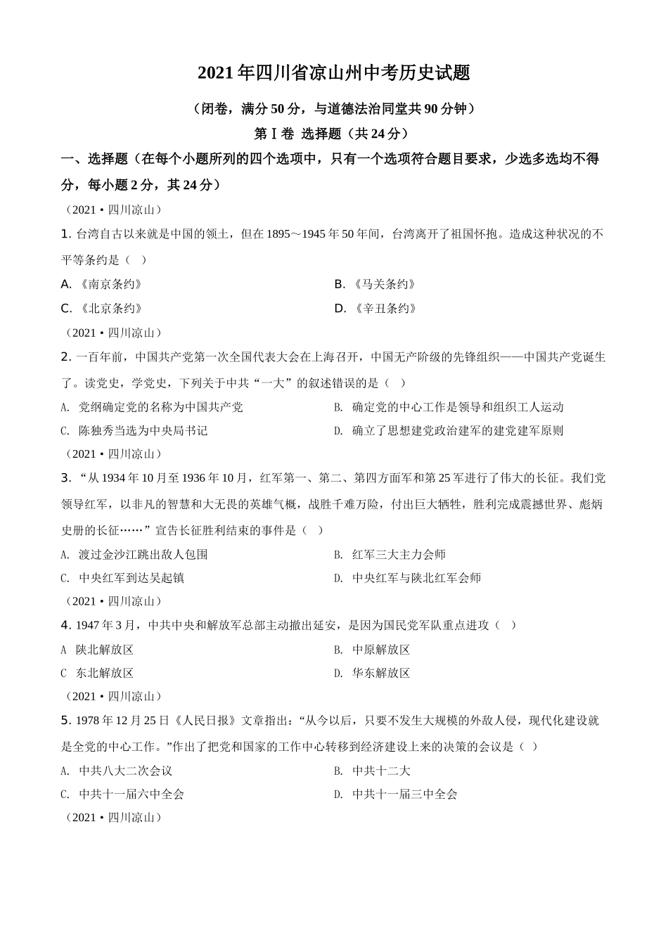 2021年四川省凉山州中考历史试题(闭卷,满分50分,与道德法治同堂共90分钟)第Ⅰ卷选择题(共24分)一、选择题(在每个小题所列的四个选项中,只有一个选项符合题目要求,少选多选均不得分,每小题2分,其24分)...