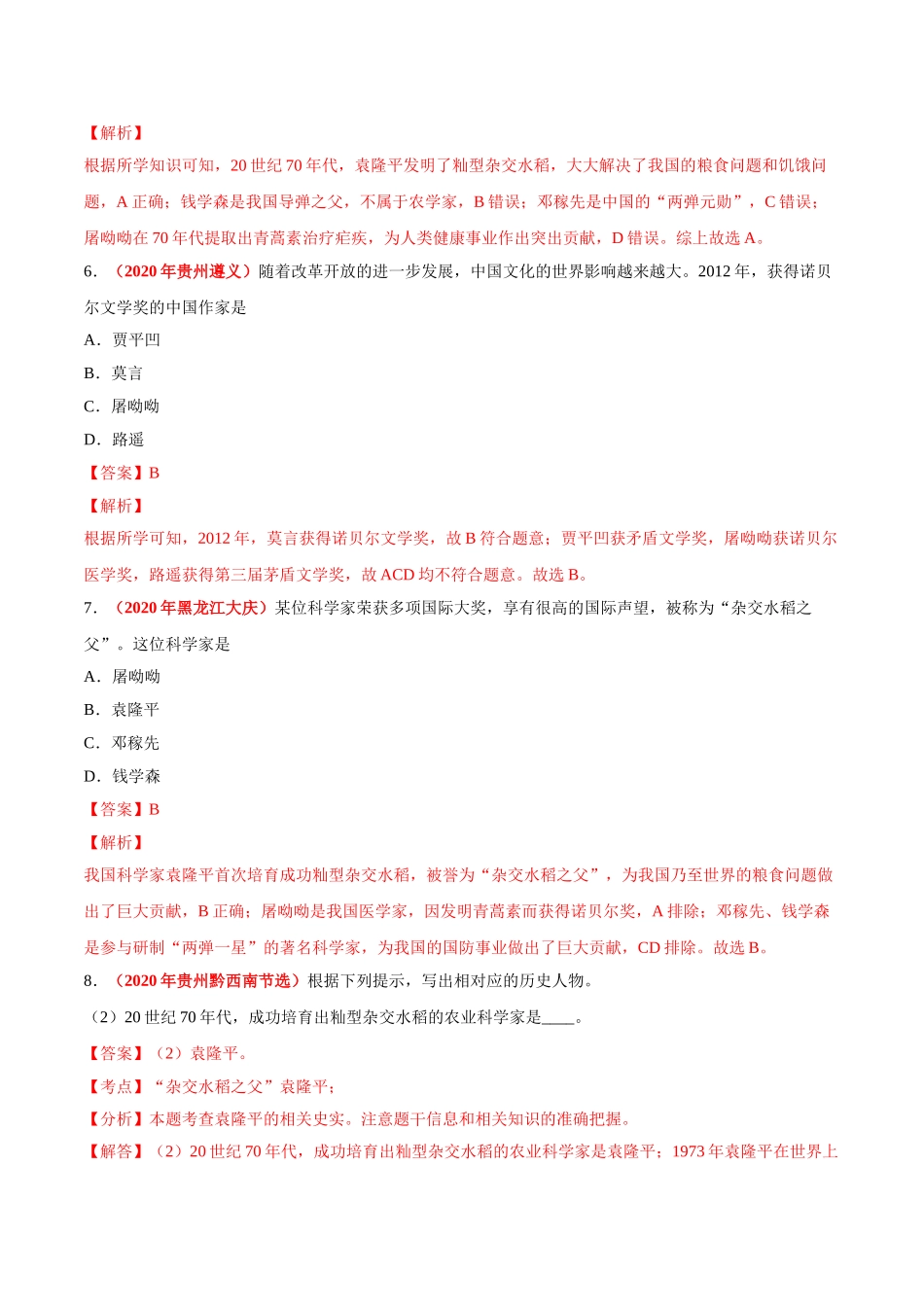 2020年中考真题历史分项汇编专题19现代科技文化与社会生活考点82科技文化成就1.(2020年湖南衡阳)《走向丰衣足食的世界》一书中写道:“他在农业科学上的成就击败了饥饿的威胁,领导着人们走向丰衣足食的世界。...