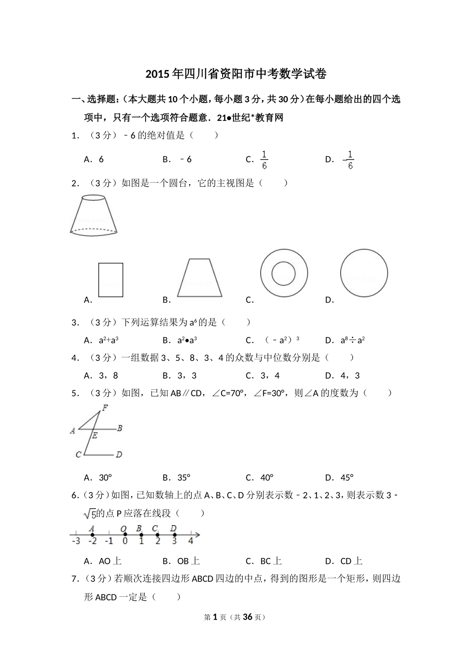 2015年四川省资阳市中考数学试卷一、选择题:(本大题共10个小题,每小题3分,共30分)在每小题给出的四个选项中,只有一个选项符合题意.21•世纪*教育网1.(3分)﹣6的绝对值是()A.6B.﹣6C.D.2.(3分)...