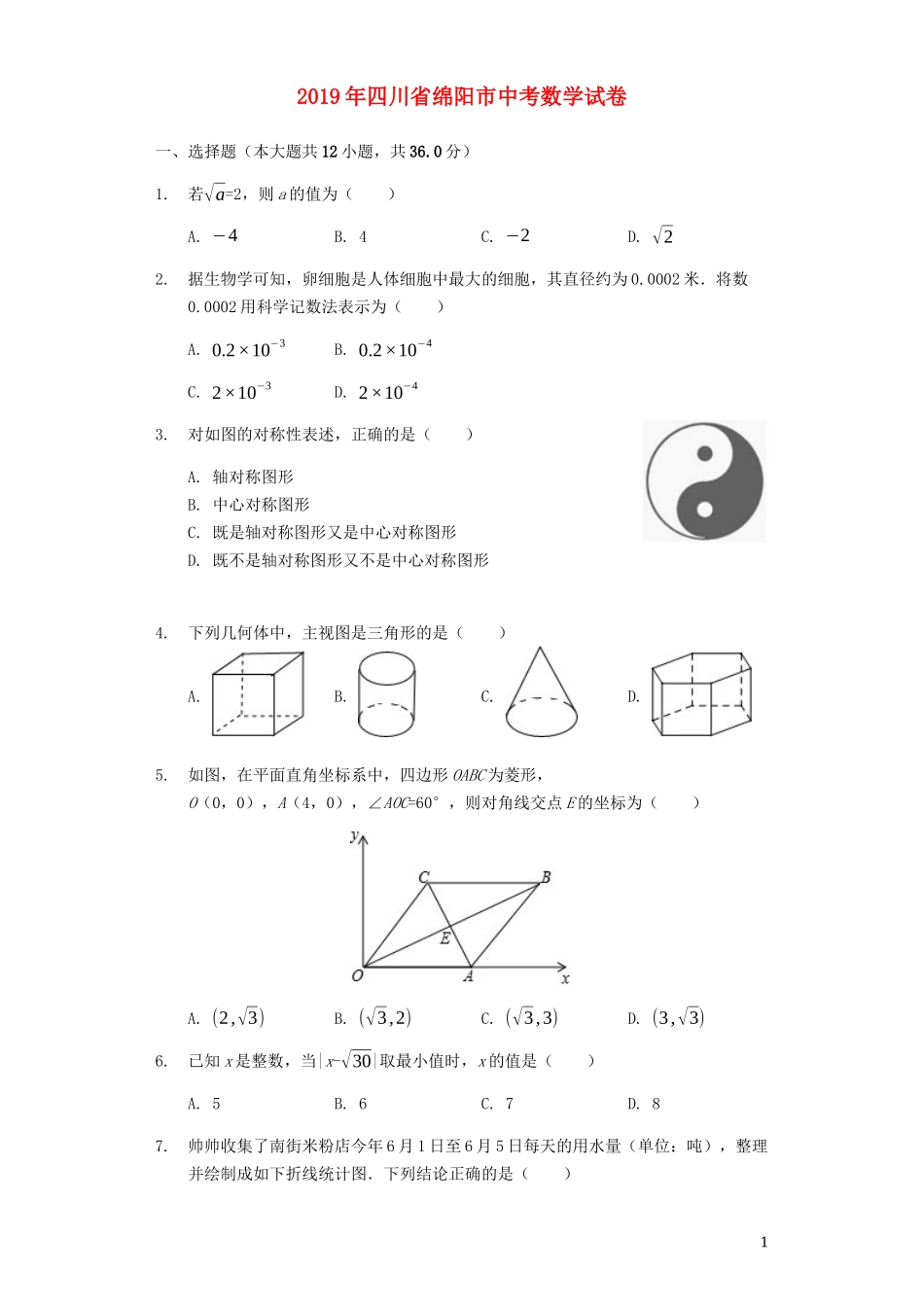 2019年四川省绵阳市中考数学试卷一、选择题(本大题共12小题,共36.0分)1.若√a=2,则a的值为()A.−4B.4C.−2D.√22.据生物学可知,卵细胞是人体细胞中最大的细胞,其直径约为0.0002米.将数0.0002用科学记数...