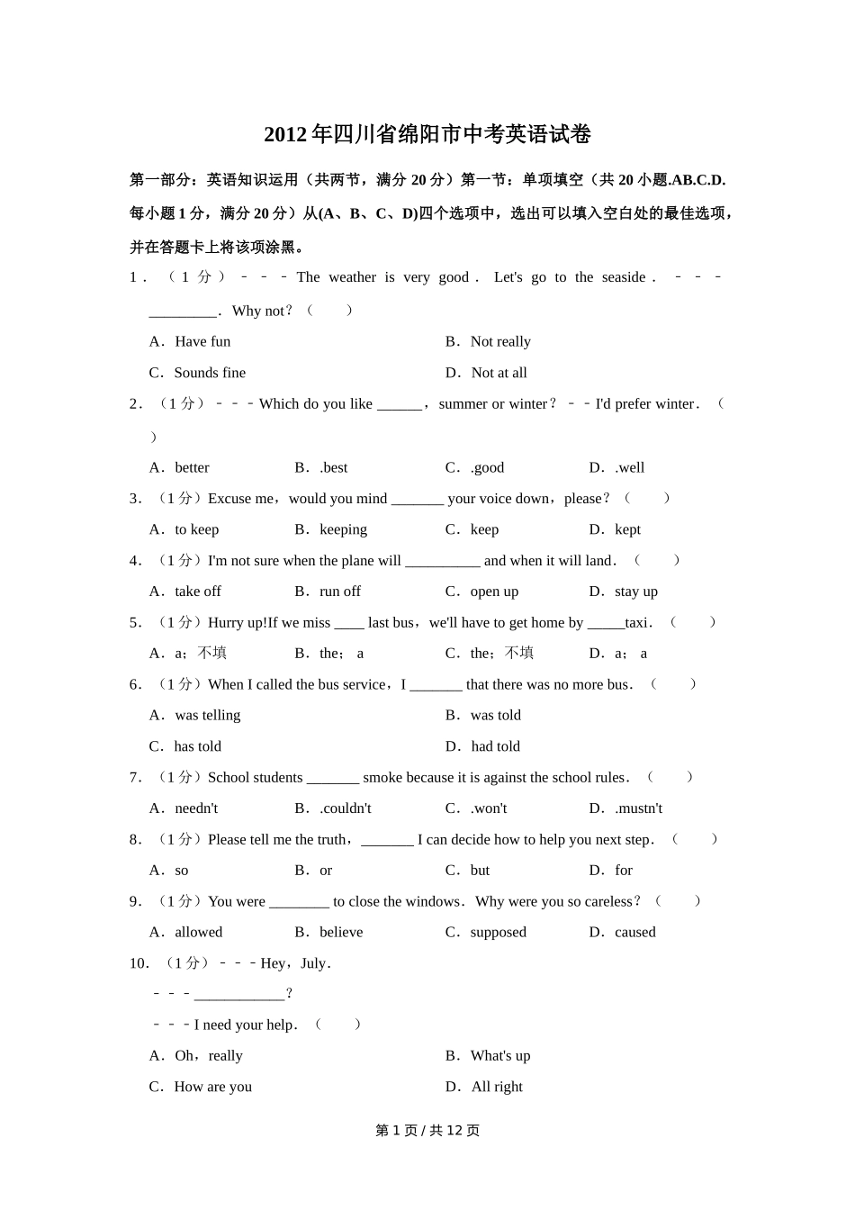 2012年四川省绵阳市中考英语试卷第一部分:英语知识运用(共两节,满分20分)第一节:单项填空(共20小题.AB.C.D.每小题1分,满分20分)从(A、B、C、D)四个选项中,选出可以填入空白处的最佳选项,并在答题卡上将...