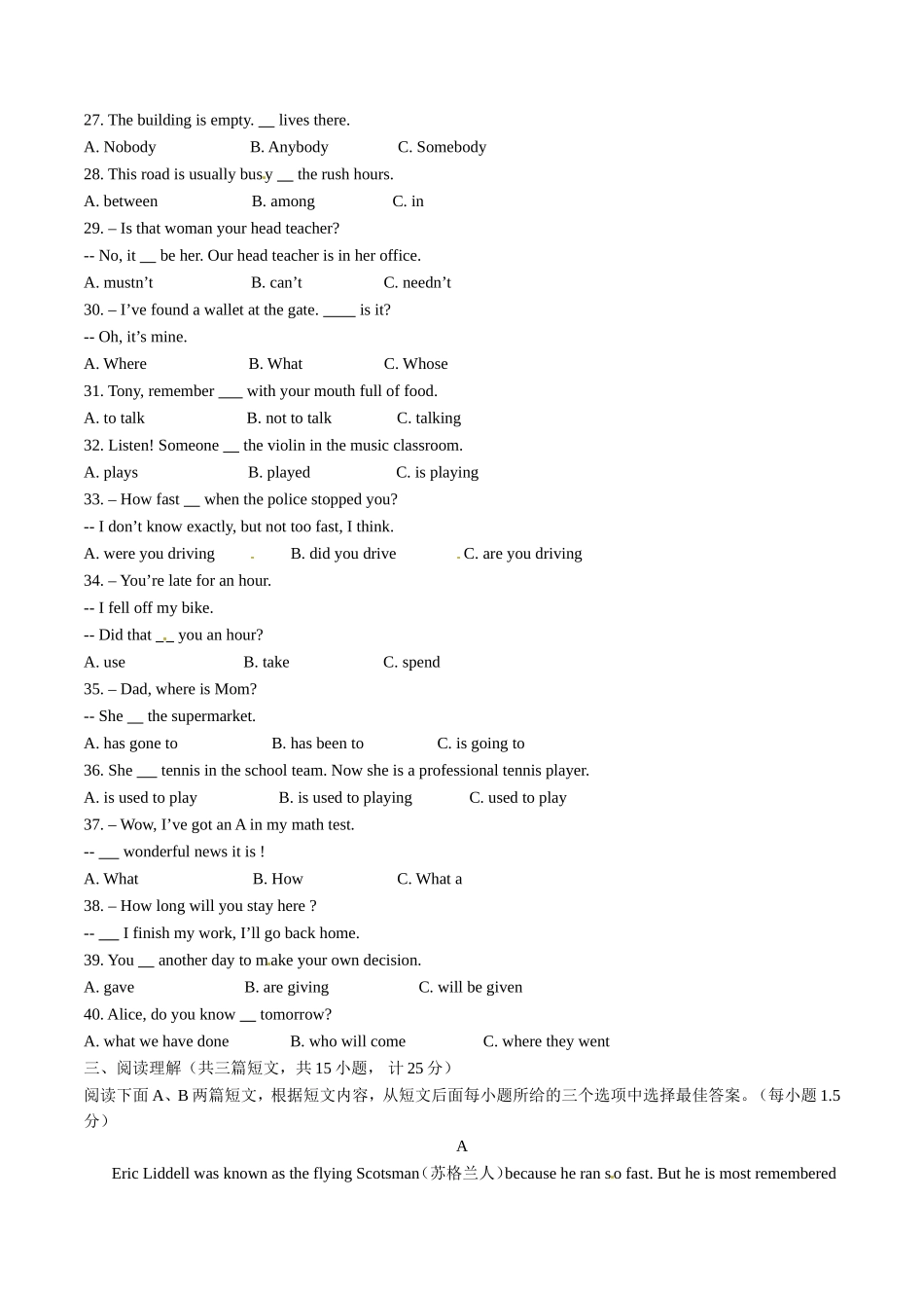威海市2015年初中学业考试英语注意事项:1.本试卷共8页,共120分,考试时间90分钟。考试结束后,将本席卷和答题卡一并交回。2.答题前,考生务必用0.5毫米黑色签字笔将自己的姓名、准考证号、座号填写在答题卡和试...
