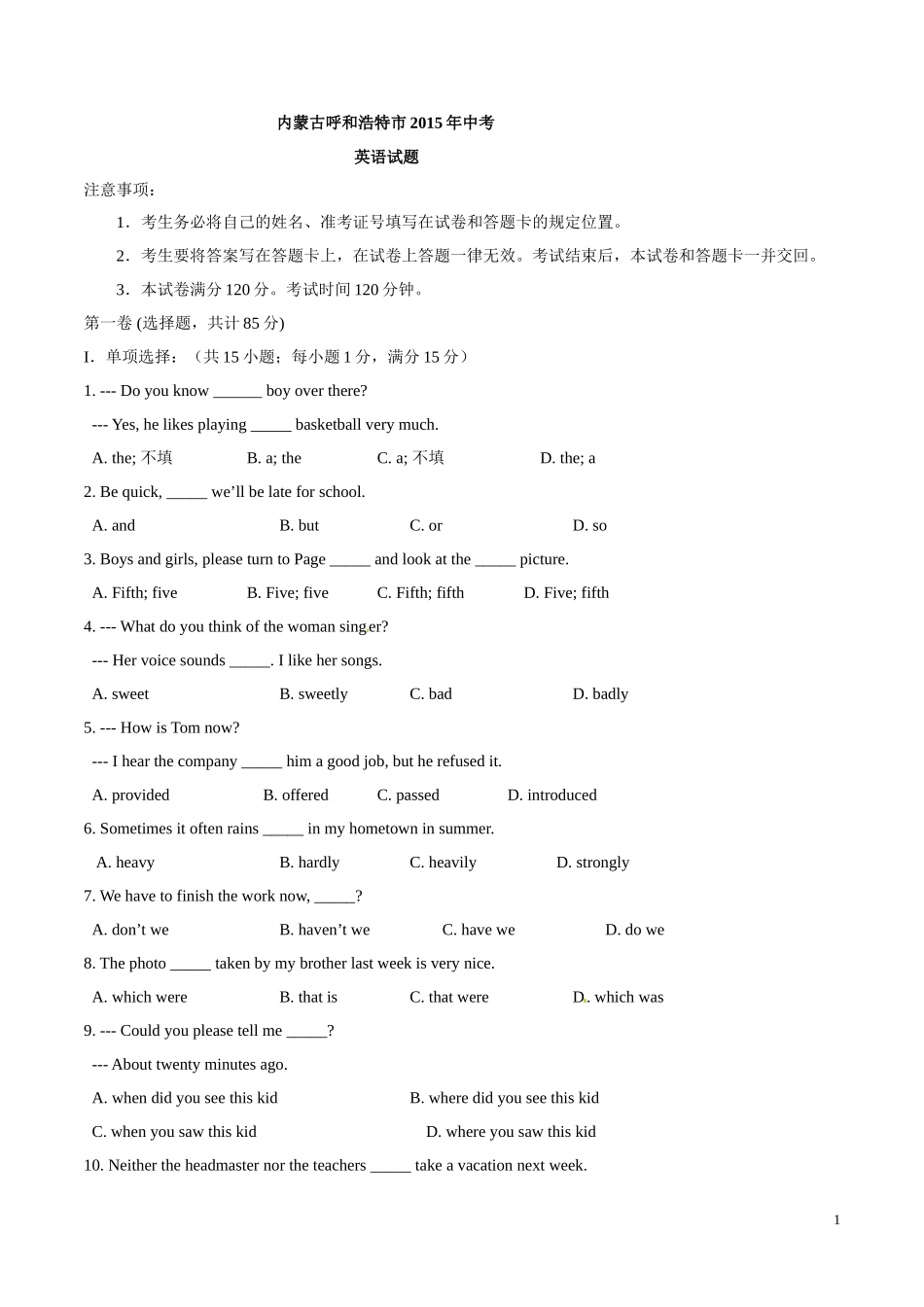 1内蒙古呼和浩特市2015年中考英语试题注意事项:1.考生务必将自己的姓名、准考证号填写在试卷和答题卡的规定位置。2.考生要将答案写在答题卡上,在试卷上答题一律无效。考试结束后,本试卷和答题卡一并交回。3...