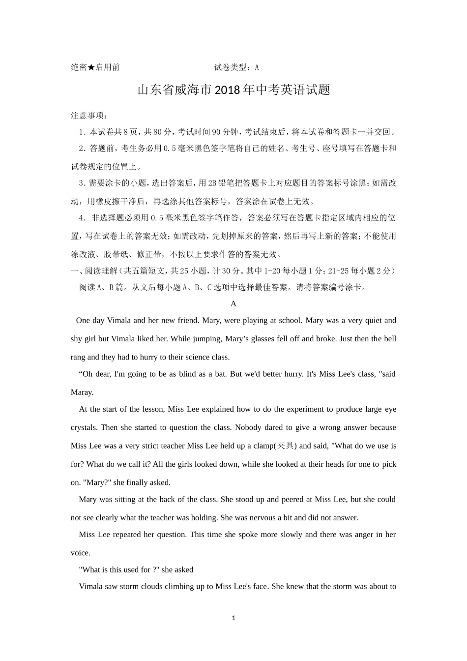 1绝密★启用前试卷类型:A山东省威海市2018年中考英语试题注意事项:1.本试卷共8页,共80分,考试时间90分钟,考试结束后,将本试卷和答题卡一并交回。2.答题前,考生务必用0.5毫米黑色签字笔将自己的姓名、考...