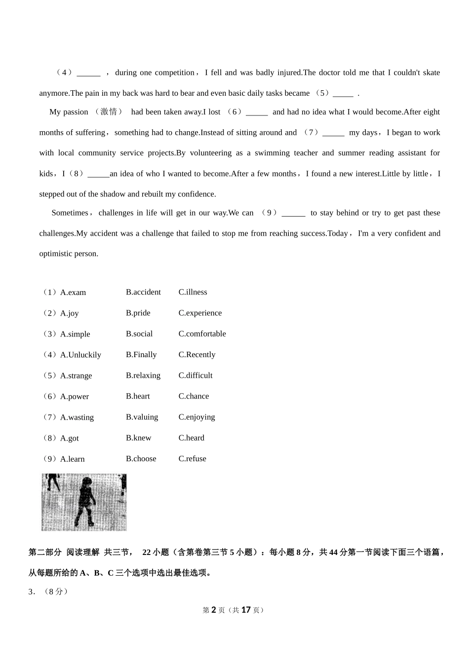 2021年贵州省贵阳市中考英语试卷第一部分完形填空共两节,16小题:每小题6分,共16分第一节阅读下面一篇短文,从短文前的选项中选出能填入空白处的最佳选项。选项中有一个为多余选项。1.(6分)从短文前的选项中...