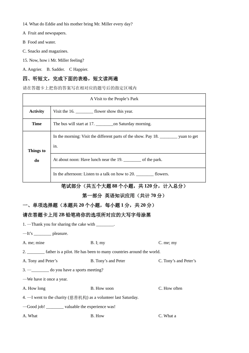 二〇二二年绥化市初中毕业学业考试英语试题考生注意:1.考试时间120分钟2.本试题分听力和笔试两部分3.所有答案都必须写在答题卡上相对应的题号后的指定区域内听力部分(共四个大题20个小题,不赋分,不计入总分)...