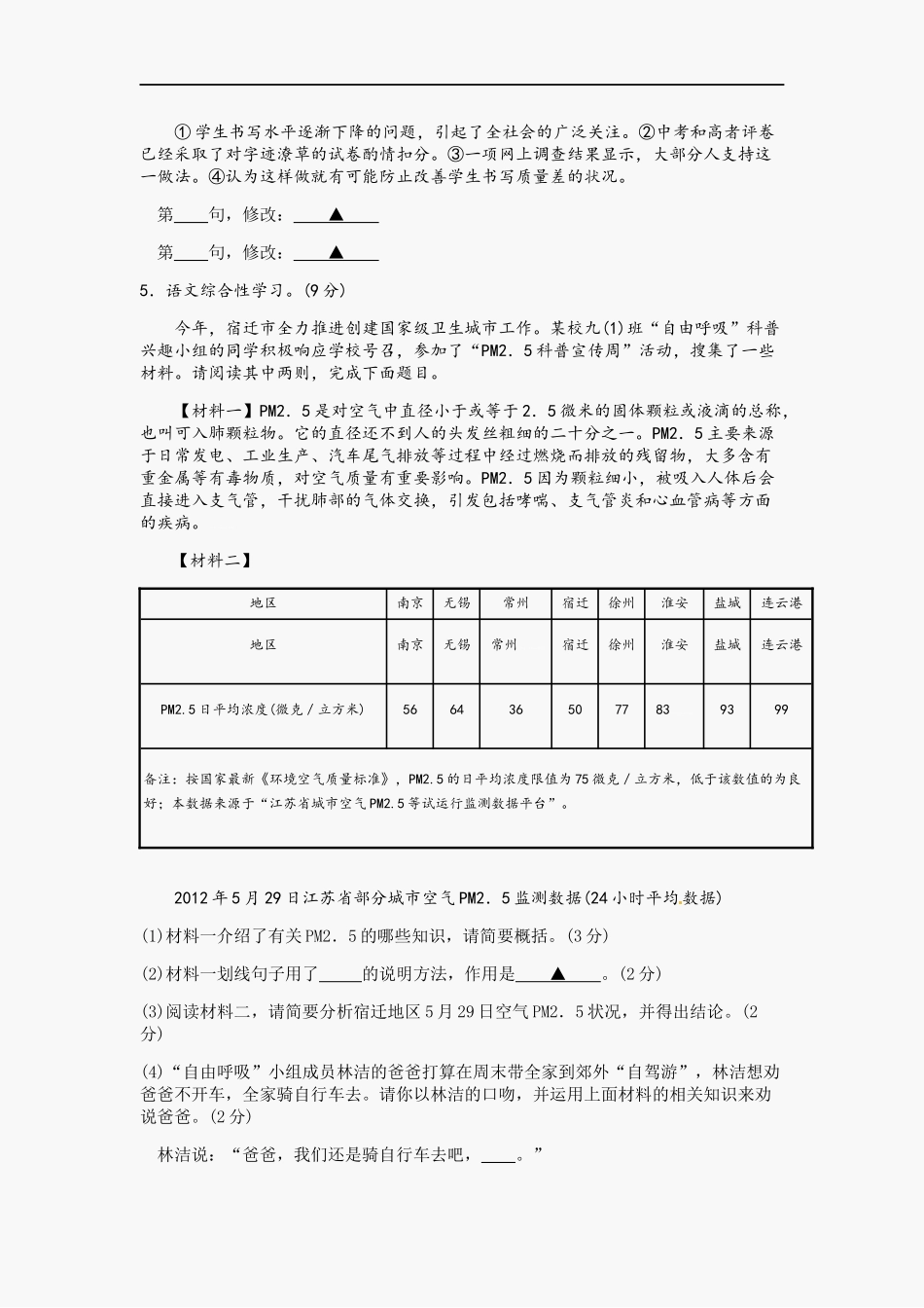 江苏省宿迁市2012年初中毕业暨升学考试语文第一部分(30分)一、语言积累与运用(30分)1.读语断,按要求完成题目。(4分)农人是教晦世人的导师,是深谙(▲)自然的智者。春的细雨中,扶犁而歌;夏的娇阳下,挥镰而舞...