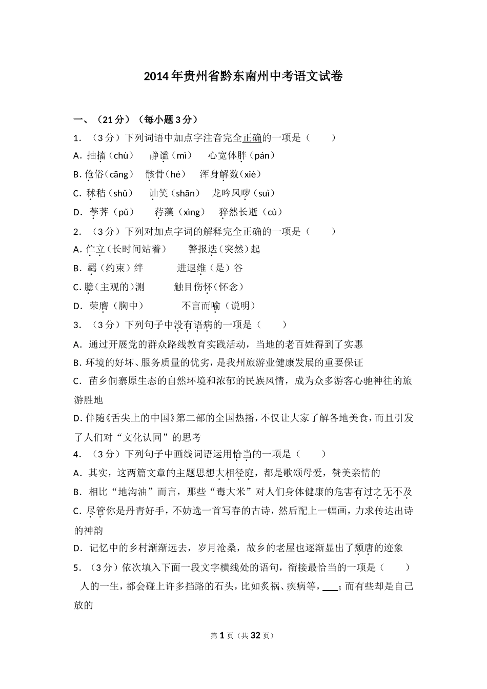 2014年贵州省黔东南州中考语文试卷一、(21分)(每小题3分)1.(3分)下列词语中加点字注音完全正确的一项是()A.抽搐(chù)静谧(mì)心宽体胖(pán)B.伧俗(cāng)骸骨(hé)浑身解数(xiè)C.秫...
