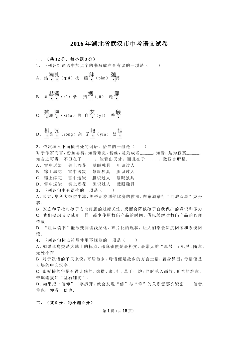 2016年武汉市中考语文试卷及答案.doc_第1页