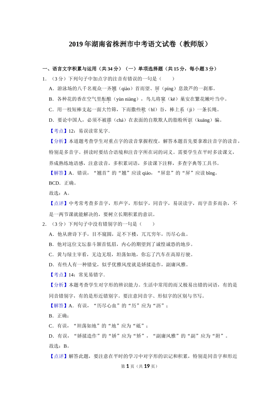 2019年湖南省株洲市中考语文试卷(教师版)一、语言文字积累与运用(共34分)(一)单项选择题(共15分,每小题3分)1.(3分)下列句子中加点字的注音有错误的一句是()A.游泳场的八千名观众一齐翘(qiào)首...