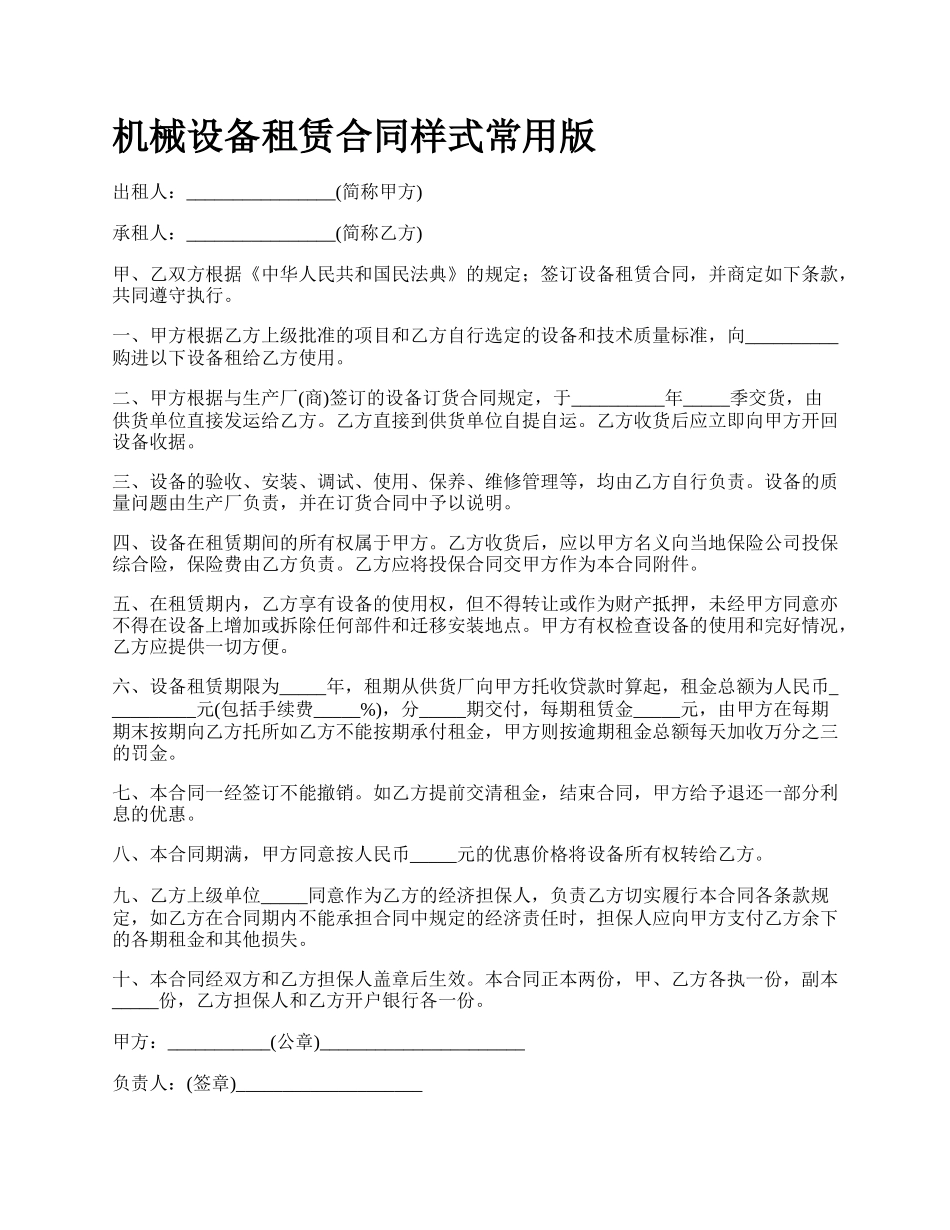 机械设备租赁合同样式常用版出租人:________________(简称甲方)承租人:________________(简称乙方)甲、乙双方根据《中华人民共和国民法典》的规定;签订设备租赁合同,并商定如下条款,共同遵守执行。一、甲方...