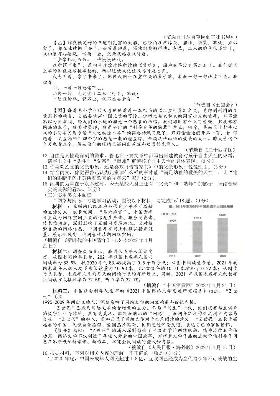 语文试题一、积累·运用(30分)(一)4·23全民阅读日,语文课上,老师带领大家阅读《人民日报》“人民论坛”的文章,请完成以下任务。(10分)作为知识的载体,书籍也是人类记忆和想象的延伸,潜藏着无限的可能...