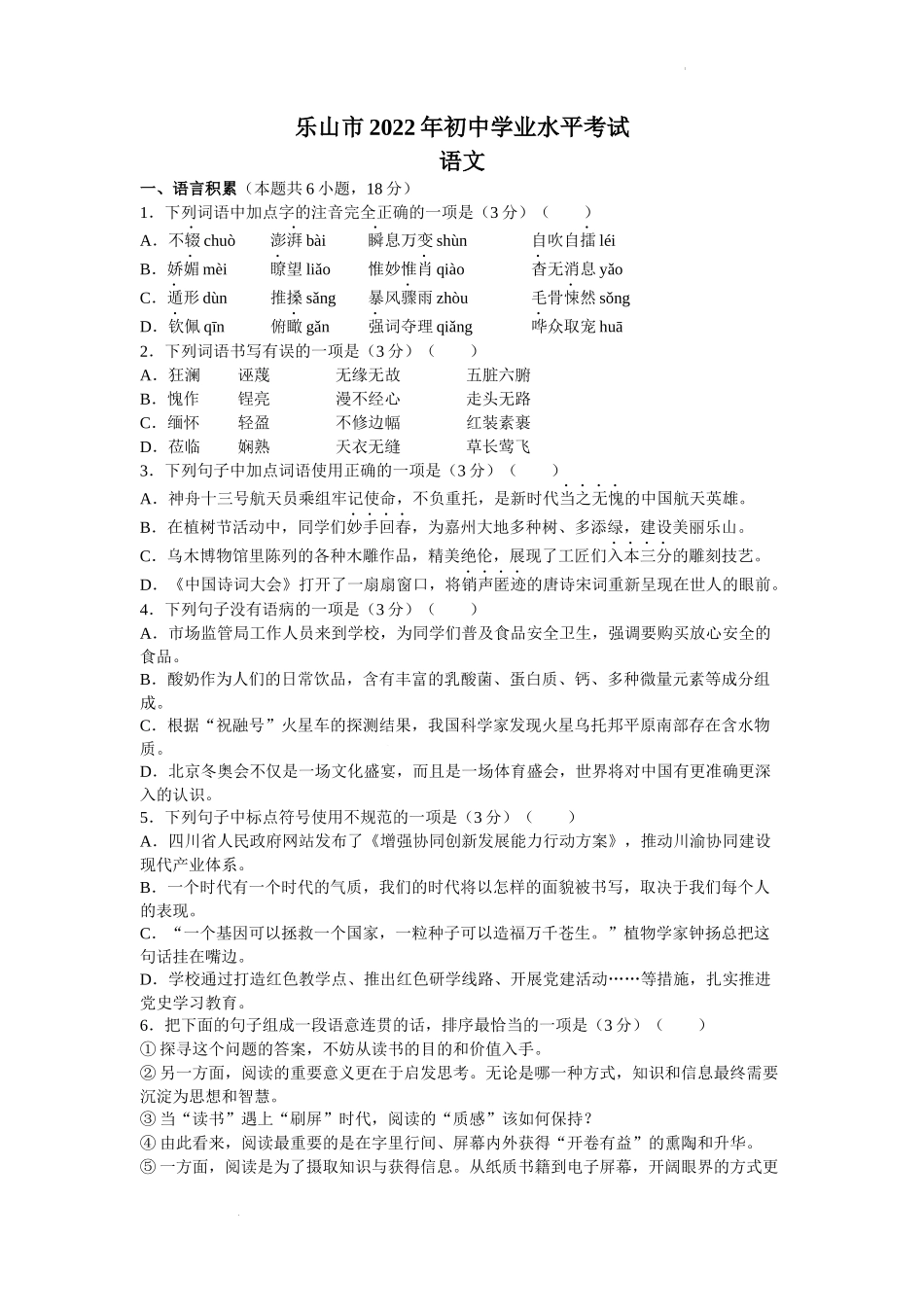 乐山市2022年初中学业水平考试语文一、语言积累(本题共6小题,18分)1.下列词语中加点字的注音完全正确的一项是(3分)()A.不辍chuò澎湃bài瞬息万变shùn自吹自擂léiB.娇媚mèi瞭望liǎo惟妙惟肖qiào杳...