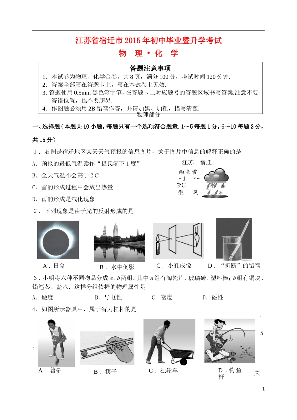 江苏省宿迁市2015年初中毕业暨升学考试物理•化学物理部分一、选择题(本题共10小题,每题只有一个选项符合题意.1~5每题1分,6~10每题2分,共15分)1.右图是宿迁地区某天天气预报的信息图片,关于图片中信息...