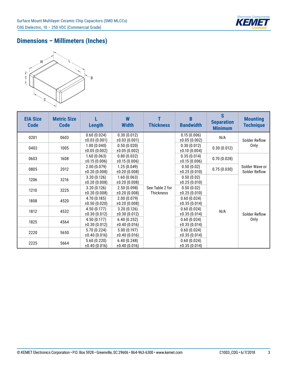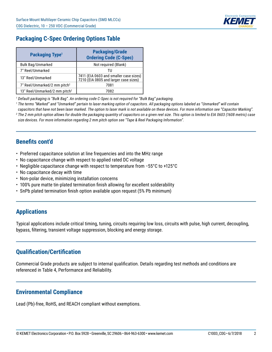 ©KEMETElectronicsCorporation•P.O.Box5928•Greenville,SC29606•864-963-6300•www.kemet.comC1003_C0G•6/7/20181Oneworld.OneKEMETBenefits•−55°Cto+125°Coperatingtemperaturerange•Lead(Pb)-free,Ro...