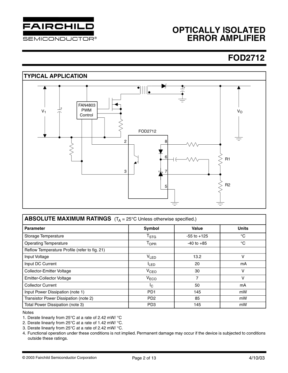 4/10/03OPTICALLYISOLATEDERRORAMPLIFIERPage1of13FOD2712©2003FairchildSemiconductorCorporationPACKAGEDIMENSIONSFUNCTIONALBLOCKDIAGRAMDESCRIPTIONTheFOD2712OpticallyIsolatedAmplifierconsistsofthepopul...