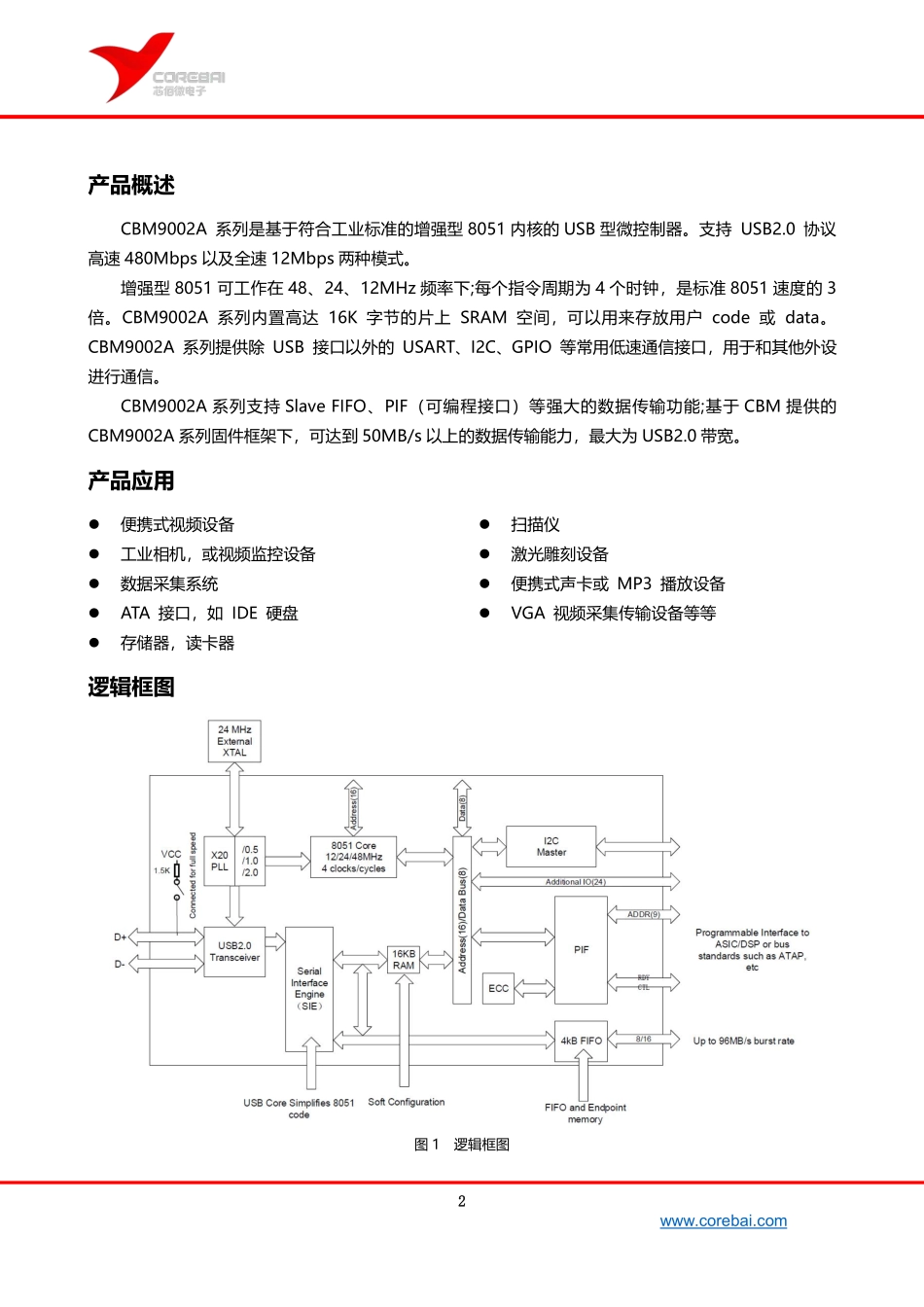 1www.corebai.com产品特点内核:兼容工业标准的增强型8051内核48MHz、24MHz、12MHzCPU工作频率每个指令周期为4个时钟2个UART3个定时器/计数器2个数据指针扩展中断系统矢量式USB中断和PIF/FIFO中断...