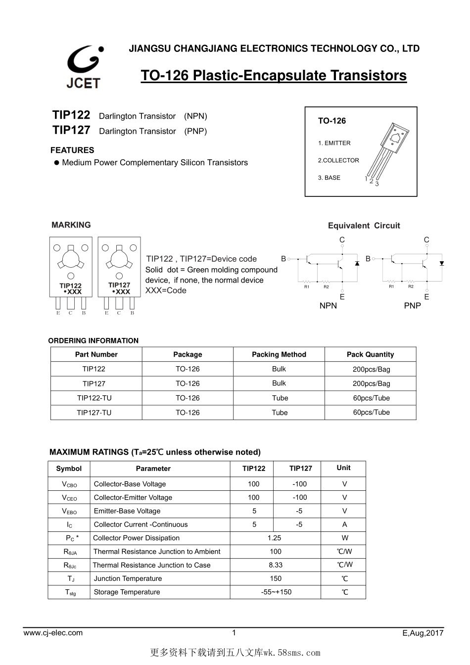 FEATURESMediumPowerComplementarySiliconTransistorsMAXIMUMRATINGS(Ta=25℃unlessotherwisenoted)SymbolParameterTIP122TIP127UnitVCBOCollector-BaseVoltage100VVCEOCollector-EmitterVoltage100VVEBOEmitter-...