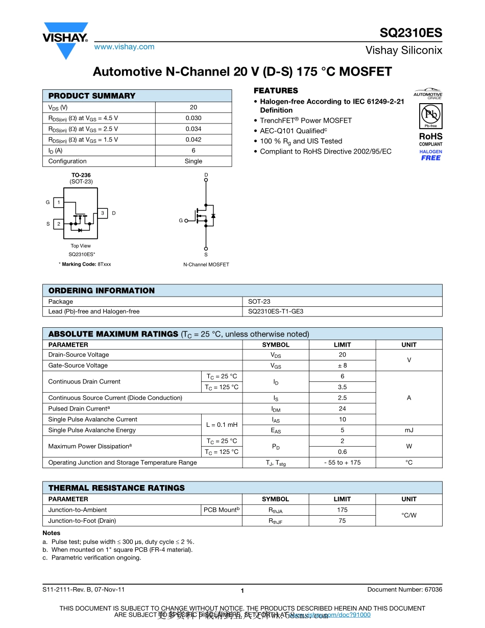 SQ2310ESwww.vishay.comVishaySiliconixS11-2111-Rev.B,07-Nov-111DocumentNumber:67036THISDOCUMENTISSUBJECTTOCHANGEWITHOUTNOTICE.THEPRODUCTSDESCRIBEDHEREINANDTHISDOCUMENTARESUBJECTTOSPECIFICDISCLAIMERS...