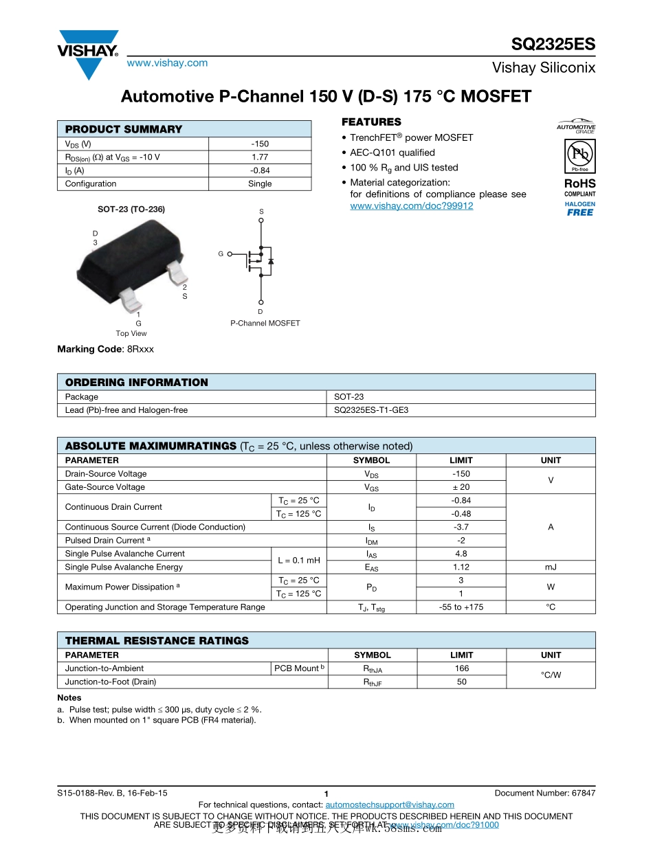 SQ2325ESwww.vishay.comVishaySiliconixS15-0188-Rev.B,16-Feb-151DocumentNumber:67847Fortechnicalquestions,contact:automostechsupport@vishay.comTHISDOCUMENTISSUBJECTTOCHANGEWITHOUTNOTICE.THEPRODUCTSDE...