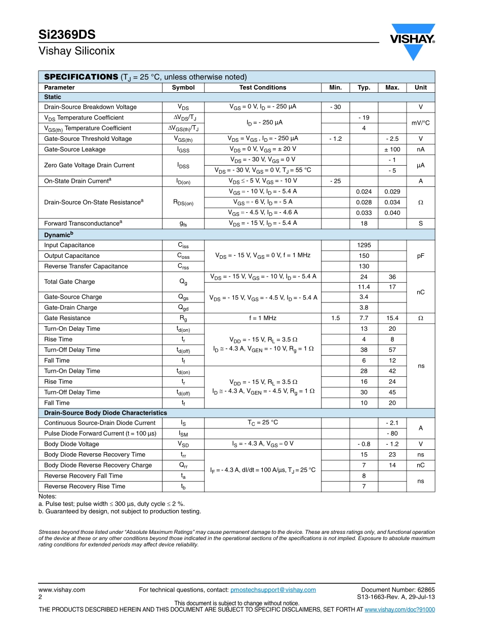 VishaySiliconixSi2369DSDocumentNumber:62865S13-1663-Rev.A,29-Jul-13www.vishay.com1Thisdocumentissubjecttochangewithoutnotice.THEPRODUCTSDESCRIBEDHEREINANDTHISDOCUMENTARESUBJECTTOSPECIFICDISCLAIMERS...