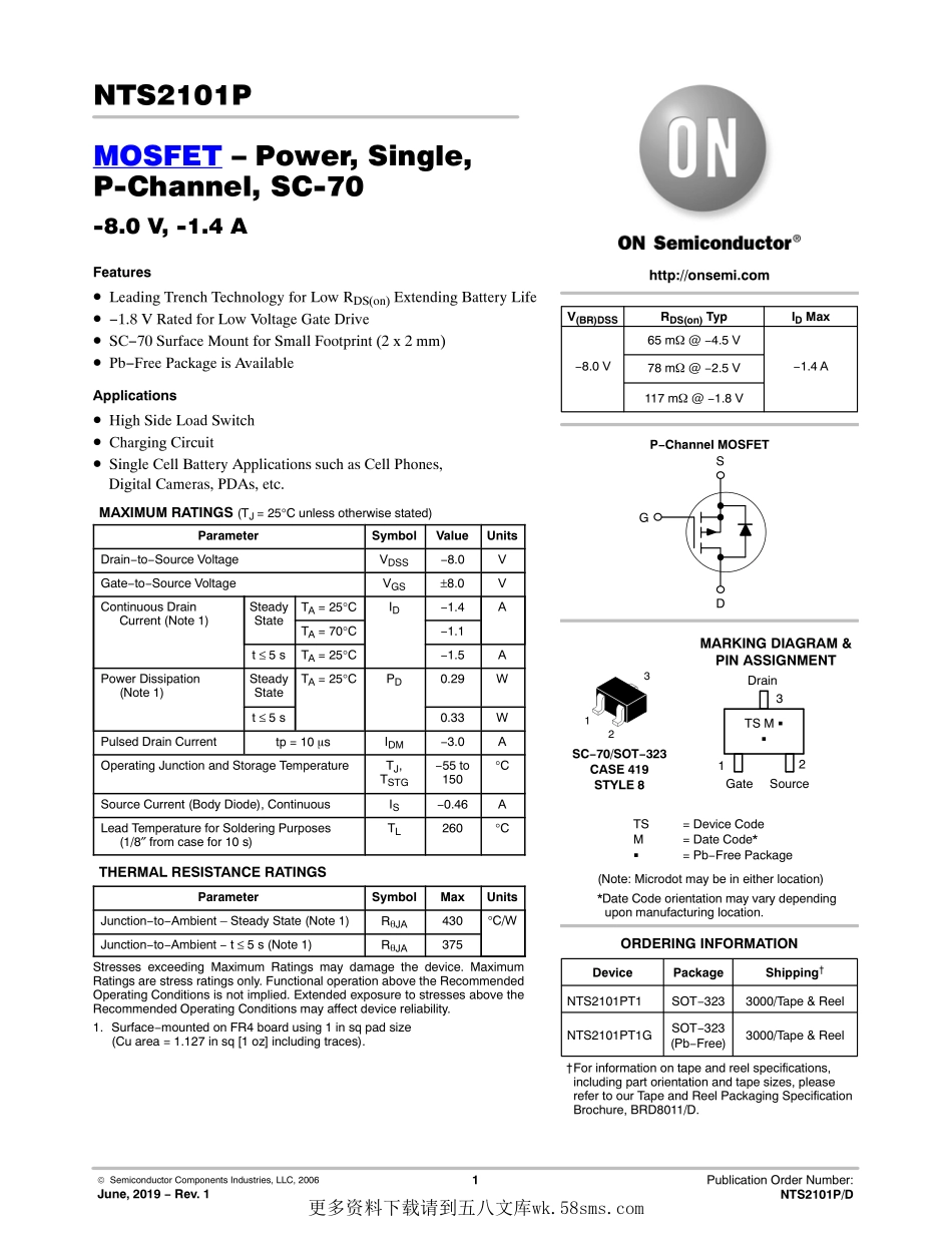 ©SemiconductorComponentsIndustries,LLC,2006June,2019−Rev.11PublicationOrderNumber:NTS2101P/DNTS2101PMOSFET–Power,Single,P-Channel,SC-70-8.0V,-1.4AFeatures•LeadingTrenchTechnologyforLowRDS(on)Ex...