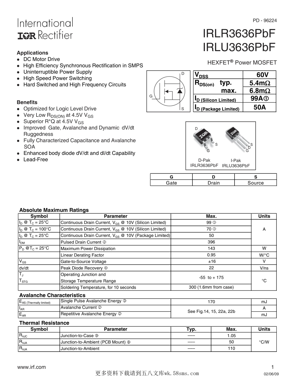 02/06/09www.irf.com1HEXFET��PowerMOSFETIRLR3636PbFIRLU3636PbFGDSGateDrainSourceSDGD-PakIRLR3636PbFI-PakIRLU3636PbF������Applications��DCMotorDrive��HighEfficiencySynchronousRectificatio...