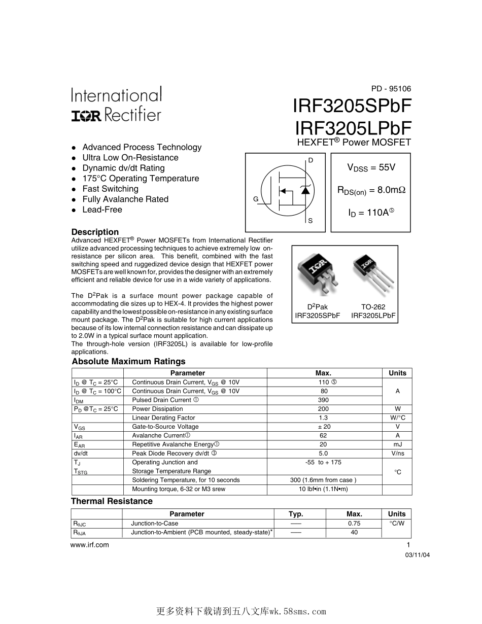 IRF3205SPbFIRF3205LPbFHEXFET®PowerMOSFET03/11/04ThermalResistancewww.irf.com1VDSS=55VRDS(on)=8.0mΩID=110A�SDGAdvancedHEXFET®PowerMOSFETsfromInternationalRectifierutilizeadvancedprocessingtechni...