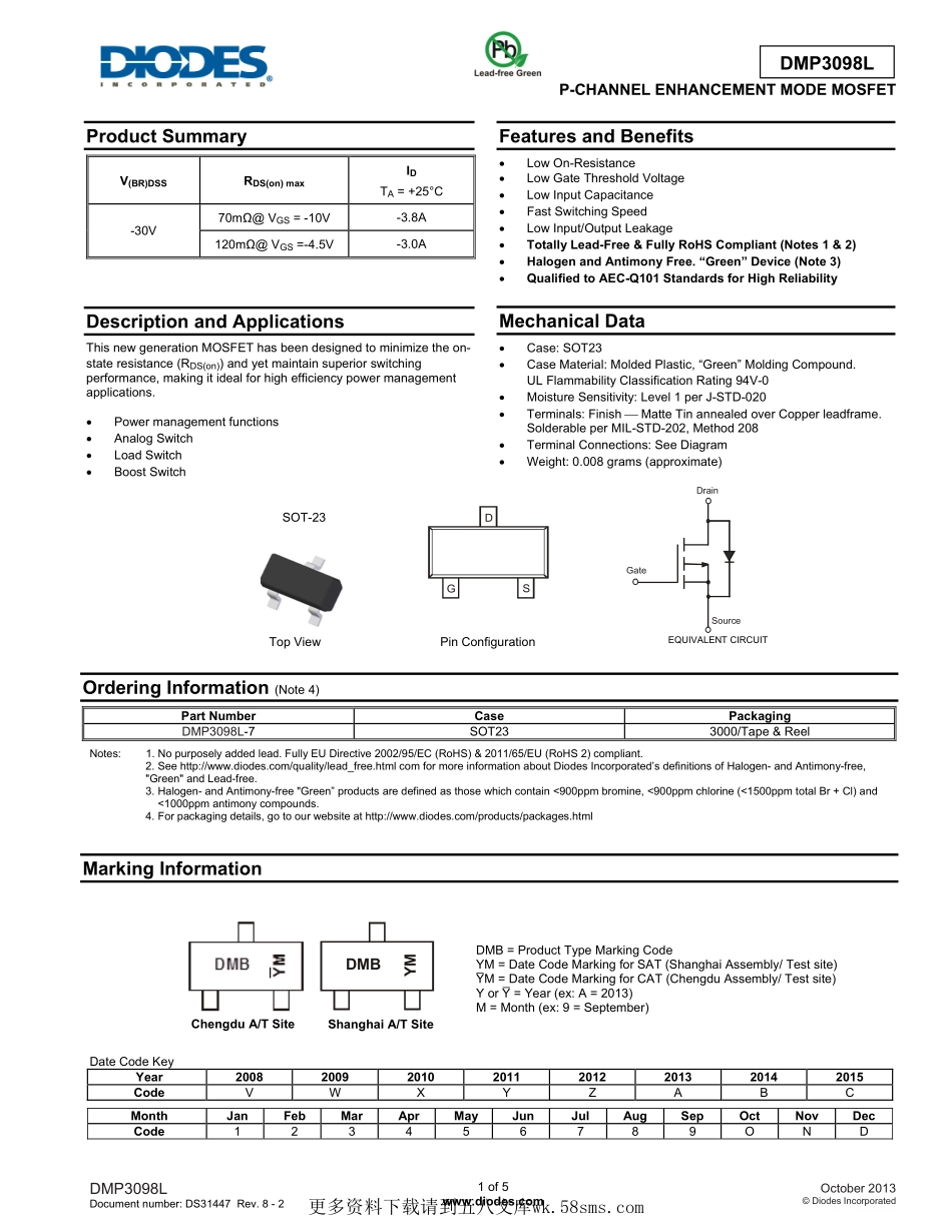 DMP3098LDocumentnumber:DS31447Rev.8-21of5www.diodes.comOctober2013©DiodesIncorporatedDMP3098LNEWPRODUCTP-CHANNELENHANCEMENTMODEMOSFETProductSummaryV(BR)DSSRDS(on)maxIDTA=+25°C-30V70mΩ@VGS=-10V-3...