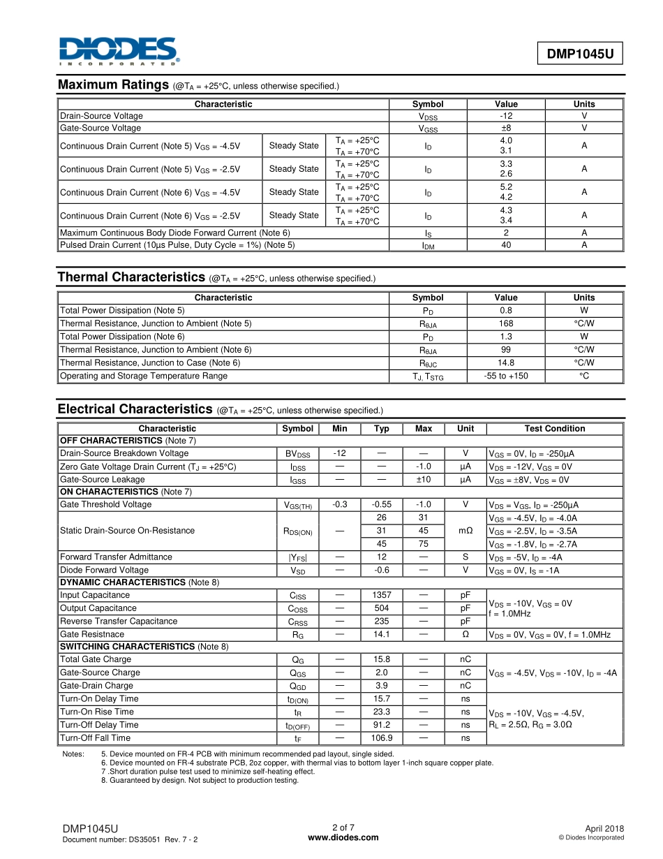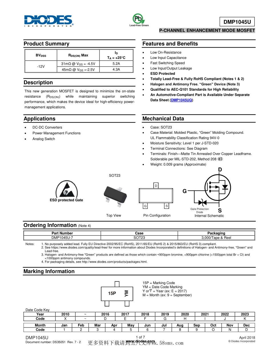 DMP1045UDocumentnumber:DS35051Rev.7-21of7www.diodes.comApril2018©DiodesIncorporatedDMP1045UP-CHANNELENHANCEMENTMODEMOSFETProductSummaryBVDSSRDS(ON)MaxIDTA=+25°C-12V31mΩ@VGS=-4.5V5.2A45mΩ@VGS=-2...