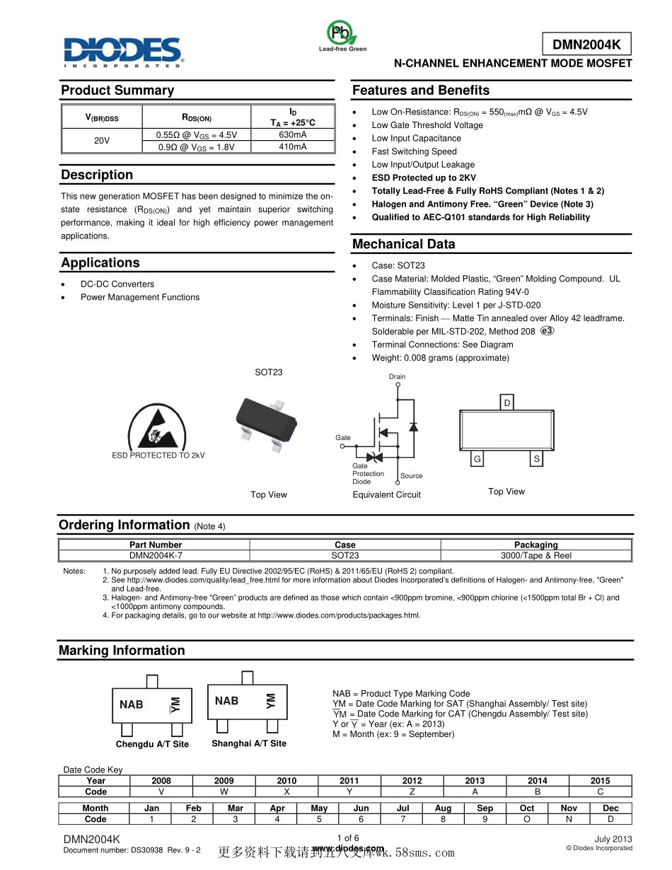 DMN2004KDocumentnumber:DS30938Rev.9-21of6www.diodes.comJuly2013©DiodesIncorporatedDMN2004KN-CHANNELENHANCEMENTMODEMOSFETProductSummaryV(BR)DSSRDS(ON)IDTA=+25°C20V0.55Ω@VGS=4.5V630mA0.9Ω@VGS=1.8...