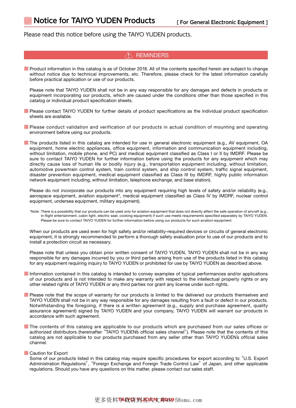 NoticeforTAIYOYUDENProducts[ForGeneralElectronicEquipment]PleasereadthisnoticebeforeusingtheTAIYOYUDENproducts.REMINDERS■ProductinformationinthiscatalogisasofOctober2018.Allofthecontentsspecifiedh...